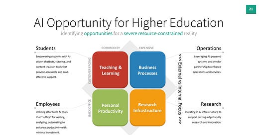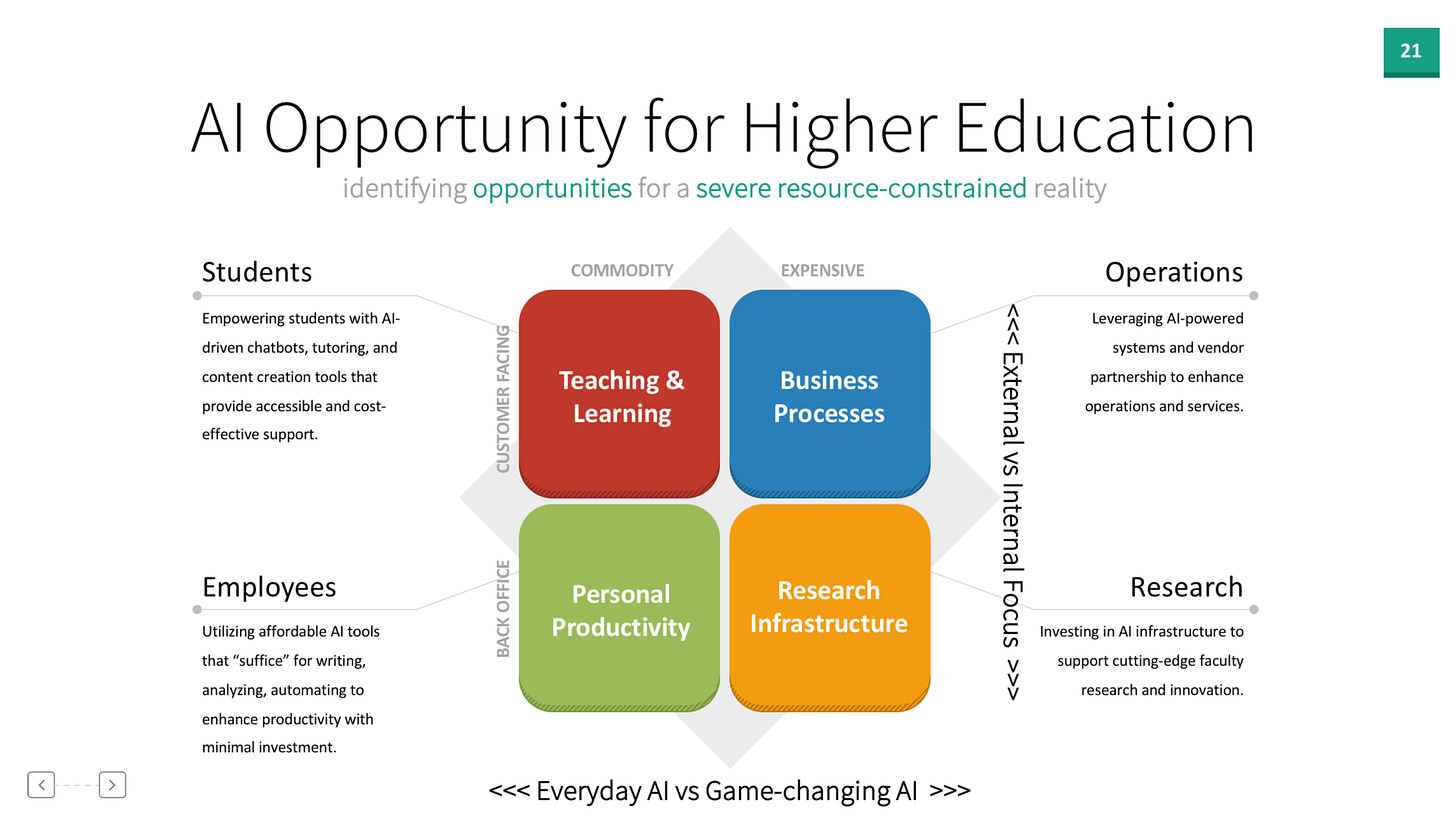 Invest where AI is a differentiator: Institutions should focus game-changing AI investments in areas where they provide a clear strategic advantage—such as research infrastructure, AI-driven decision-making, and cutting-edge enterprise systems.